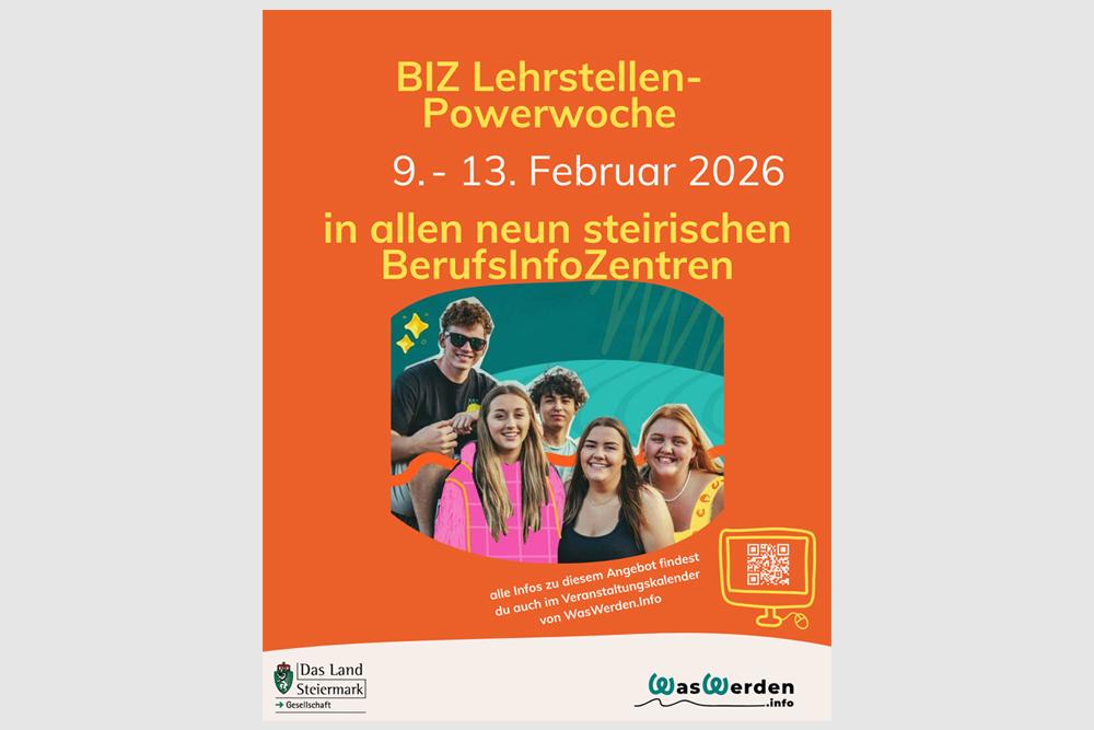 Du interessierst dich für eine Lehrausbildung? Dann aufgepasst! 9. bis 13. Februar: BIZ Lehrstellen-Powerwoche In den neun steirischen BerufsInfoZentren (BIZ) erfährst du alles, was du rund um das Thema Lehre & duale Ausbildung wissen musst – persönlich, kostenlos und kompetent. Termin vereinbaren? Direkt bei deinem BIZ! Alle Kontaktdaten findest du unter: biz-steiermark.ams.at Mehr Infos zur Lehrstellen-Powerwoche gibt’s auch im Veranstaltungskalender auf waswerden.info