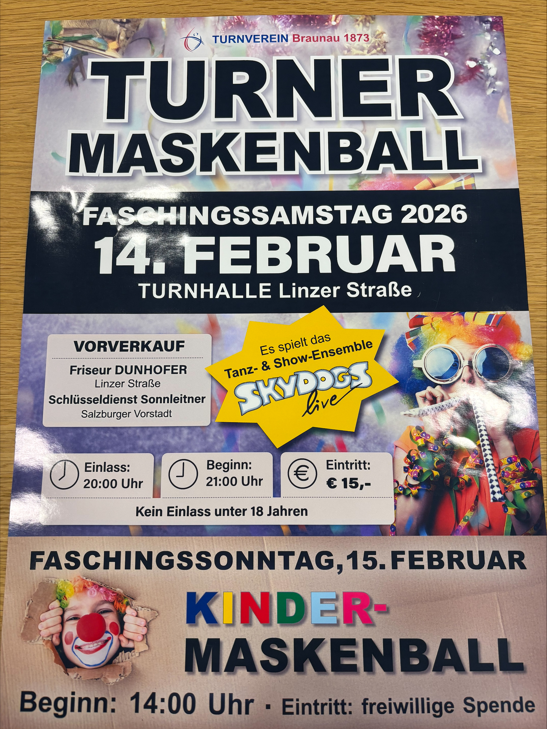 Der Turnverein Braunau lädt am Faschingssamstag zum traditionellen Turnermaskenball in die Turnhalle in der Linzerstraße ein. Mit Live-Musik vom bereits etablierten Tanz- und Show-Ensemble „Sky Dogs“ darf wieder ausgiebig Fasching gefeiert werden.