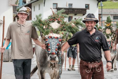Bauern und begleitenden Helfern über die Rückkehr der Herde freuen. Die festlich geschmückten Kühe mit Kopfputz und Glocken, ganz nach alter bäuerlicher Tradition, tragen die Freude über die Rückkehr ins Tal, stolz zur Schau.