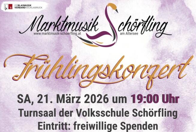 Am Samstag, 21. März 2026 findet um 19:00 Uhr das Frühlingskonzert der Marktmusik Schörfling am Attersee im Turnsaal der Volksschule Schörfling a.A. statt.