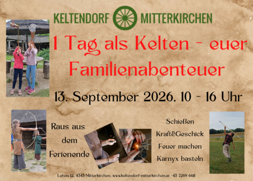 Am 13. September 2026 verwandelt sich das Keltendorf Mitterkirchen erneut in einen großen Abenteuerspielplatz für die ganze Familie. Kinder und Erwachsene können gemeinsam ausprobieren, wie viel keltische Kraft, Geschicklichkeit und Neugier in ihnen steckt. An den vielen Mitmachstationen heißt es: ausprobieren, staunen und Erfolge feiern! Ob beim Schießen mit Pfeil und Bogen, beim Werfen von Heusäcken und Baumstämmen oder beim Basteln der eindrucksvollen keltischen Kriegstrompete Karnyx – überall warten spannende Herausforderungen. Ein besonderes Highlight ist das Feuermachen wie in der Keltenzeit: Unter Anleitung können die Kinder selbst ausprobieren, wie Funken entstehen – und mit etwas Geduld und der richtigen Technik schaffen es viele sogar, ein kleines, echtes Glutnest zu entfachen. Ein Erlebnis, das stolz macht! Wer zwischendurch eine Stärkung braucht, ist in der Jausenstation genau richtig: Entdecken Sie traditionelle Gerichte ebenso wie modern interpretierte Varianten und lassen Sie sich von überraschenden Aromen begeistern. |