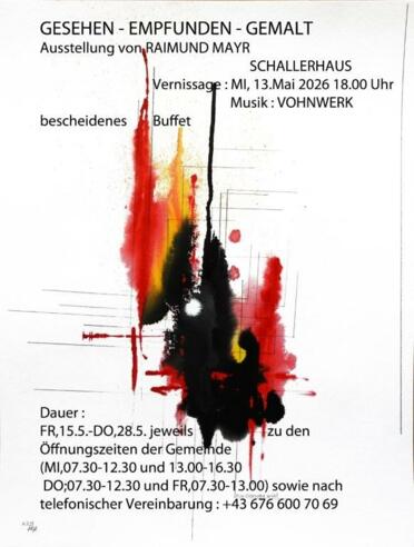 Im Mai lädt die Ausstellung von Raimund Mayr in die Galerie im Schallerhaus ein. Dem Künstler ist neben der Lust, verschiedene Malgründe und „Farben“ zu verwenden, vor allem wichtig, die zugrunde liegenden Strukturen, die er sieht, auch in seinen Arbeiten zu betonen. Er setzt sich auch gerne der Eigengesetzlichkeit des Materials aus, welches er gerade bearbeitet. Der künstlerische Werdegang von Raimund Mayr führte ihn von Innsbruck aus in die Welt der Malerei – ob durch Reiner Schiestl, der Gruppe 84, Fritzi Gerber, Franz Pöhacker, Peter Mairinger oder bei Malwochen, vorwiegend in der Toskana, wurde sein bildnerisches Gestalten geprägt.