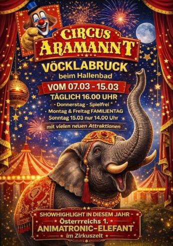 Der Frühlingszirkus gastiert von 7. bis 15. März am Freizeitgelände Vöcklabruck. Die Vorstellungen beginnen täglich um 16 Uhr, Donnerstag ist spielfrei. Montag und Freitag gelten als Familientage mit vergünstigten Eintrittspreise. Am Sonntag, 15. März, startet die finale Vorstellung bereits um 14: Uhr.