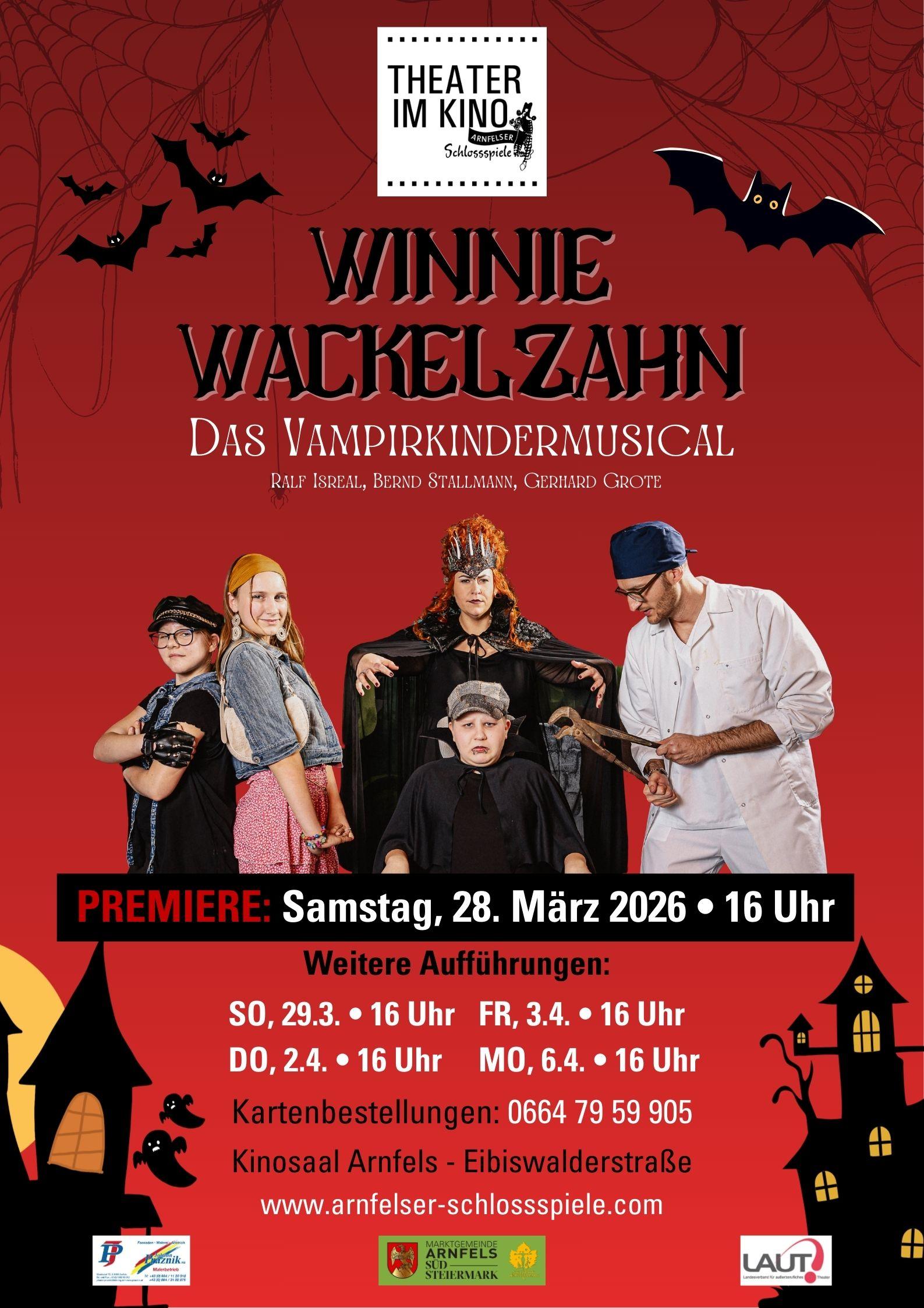 Die Arnfelser Schlossspiele laden zu einem wunderbaren Familienerlebnis ein: Mit dem Kindermusical „Winnie Wackelzahn – Das Vampirkindermusical“ verwandelt sich das Theater in eine geheimnisvolle Welt voller Fledermäuse, Zaubersprüche und wackelnder Eckzähne. Im Mittelpunkt steht der kleine Vampir Winnie Wackelzahn, der kurz vor seinem zehnten Geburtstag steht – doch ein düsteres Familiengeheimnis bedroht sein Vampirdasein. Denn wenn Winnie nicht rechtzeitig ein paar Tropfen Blut kostet, fallen ihm seine langen Eckzähne aus! Und was ist schon ein Vampir ohne Eckzähne? Gemeinsam mit seinen Freundinnen stellt er sich gefährlichen Abenteuern, einer bösen Fee und allerlei schrägen Gestalten. Mit viel Humor, mitreißender Musik und liebevoll gestalteten Kostümen verspricht das Musical beste Unterhaltung für Kinder und die ganze Familie.