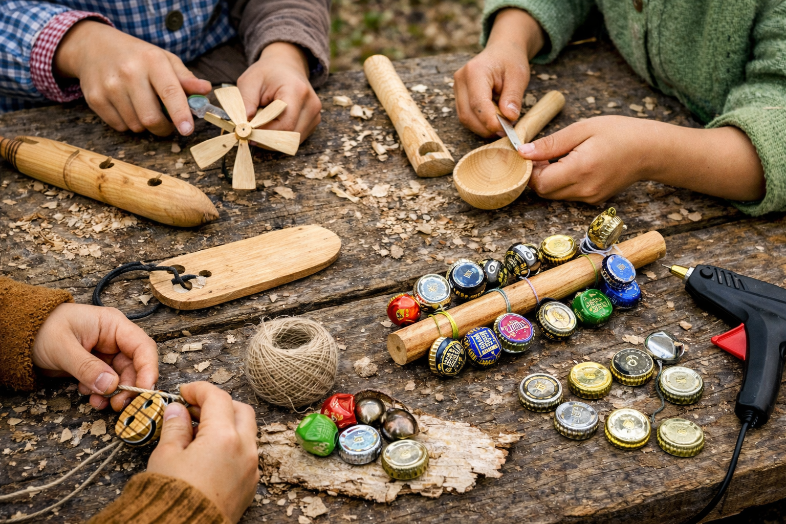 Baue und gestalte deine eigenen Rhythmus-Instrumente! Du kannst z.B. einen Schellenstab aus Bierkapseln, einen Windmacher bauen oder Holzlöffel zum Musizieren schnitzen.+