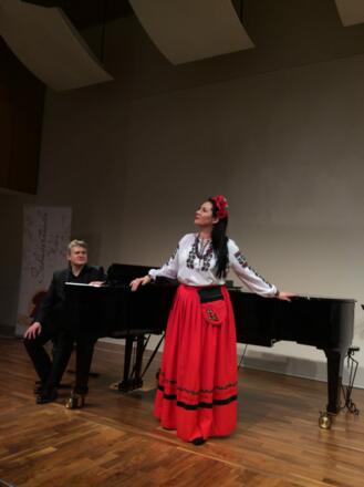 So werden die beiden Sängerinnen Viktoria Rudnik und Julia Uspenska von Oleksandr Popov und Ariadne Bartai am Klavier begleitet. Diese spielen auch auf zwei Klavieren Variationen von Wasyl Barvinsky.