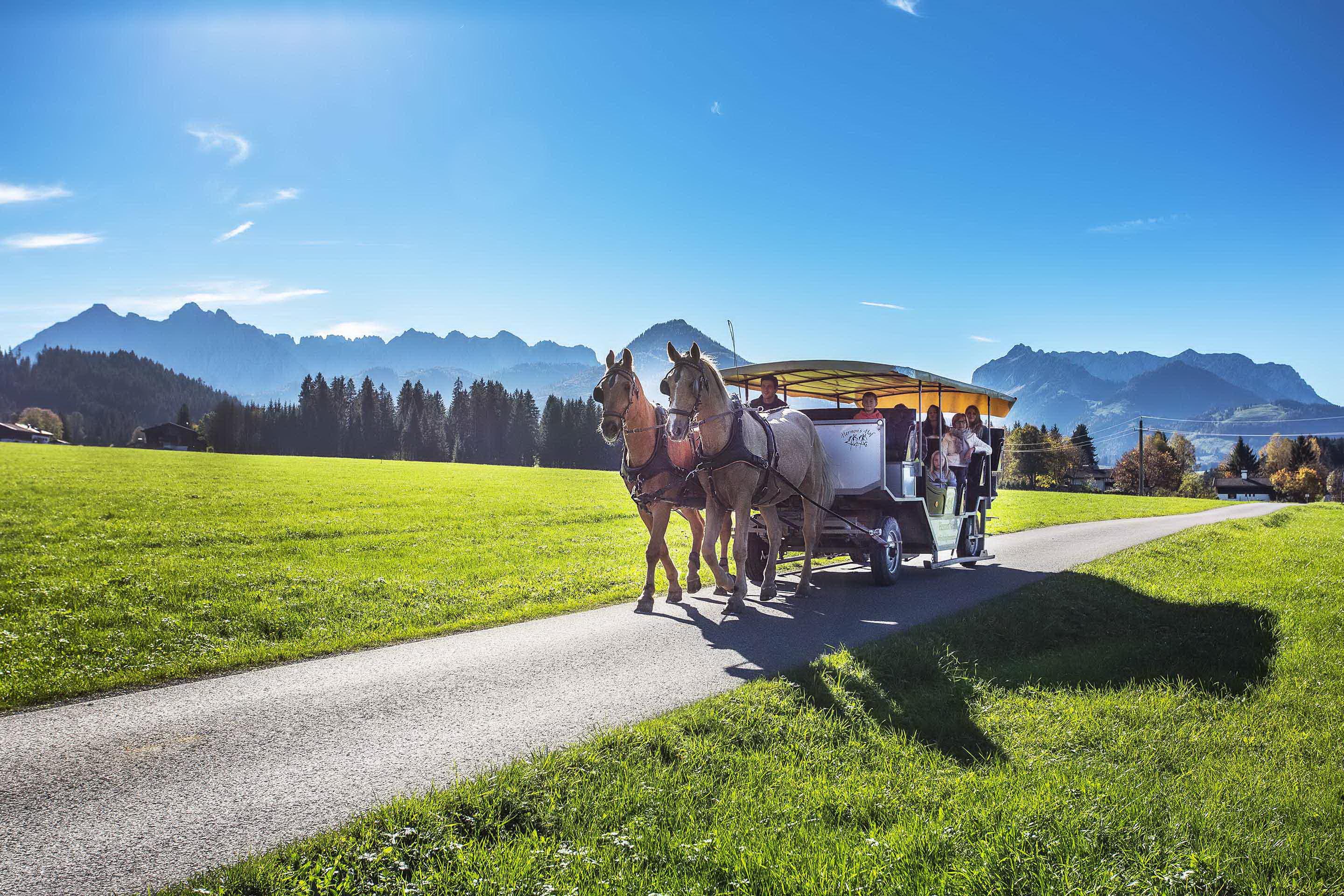 Kutschenfahrt durch die Landschaft von Kössen im schönen Kaiserwinkl.