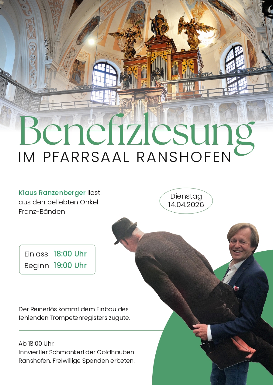 Klaus Ranzenberger liest aus den beliebten Onkel Franz-Bänden. Musikalisch wird er begleitet von Sepp Speckner. Für das leibliche Wohl sorgen die Goldhauben Ranshofen mit ihren Innviertler Schmankerln!