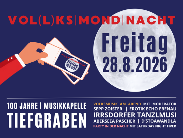 Am Freitag, 28. August lädt die Musikkapelle Tiefgraben im Rahmen ihres 100-jährigen Jubiläums zur stimmungsvollen „VOL(L)KS|MOND|NACHT“ nach Mondsee ein. Freuen Sie sich auf einen abwechslungsreichen Abend mit traditioneller Volksmusik aus der Region: Die Irrsdorfer Tanzlmusi, die Aberseea Pascher, das Erotik Echo Ebenau sowie der Trachtenverein D’Stoawandla sorgen für beste Unterhaltung. Durch das Programm führt Sepp Zoister.