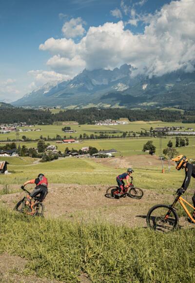 Auf den OD Trails, unserem vielseitigen Übungsgelände mit Bike-Schlepplift, üben wir einen Tag lang die richtige Sprungtechnik zuerst im Flachen und später über Tables und Drops.