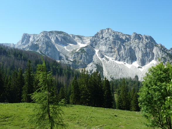 Vom Bodinggraben führt eine 3,3 km lange Forststraße dem Blöttenbach entlang nach Westen. Vorbei an der Lettneralm kommen wir nach etwa 30 Minunten zur idyllisch im Talschluss gelegenen Blumaueralm. Unser Weg führt über die Wiesenfläche und geht dann bei einer großen Kehre (Umkehrhütte) in einen Karrenweg über, der dem Bach entlangführt. Stets hat man einen prächtigen Blick auf die gewaltigen Nordabstürze des Nockmassivs. Einzigartig ist hier, dass sich der Bergmischwald unmittelbar bis in die Felsregionen hinauf erstreckt.