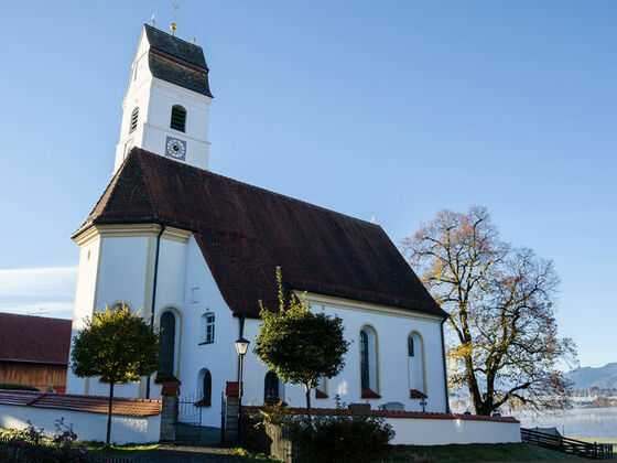Eine Tafel berichtet vom Tränenwunder Anfang des 19. Jahrhunderts, das diesen Aussichtspunkt zur Wallfahrtsstätte werden ließ. Die „Vier Linden“ waren u. a. auch Motivplatz für die alte Hinterglasmalerei und frühe Photographie. Wassily Kandinsky schuf hier 1908 die „Landschaft mit Turm“. Wir gehen die Straße weiter, auf der wir gekommen sind. Sie mündet geradeaus in einen Fußweg, der bergab unter einigen mächtigen alten Blutbuchen hindurch führt. Wir überqueren eine Straße und folgen nun dem Fußweg auf der anderen Seite in Richtung Hagen/Guglhör. Direkt nach einem einzeln stehenden Haus auf der linken Seite führt links eine Forststraße Richtung Froschhauser See/Riegsee, der wir immer geradeaus folgen, bis wir nach Froschhausen gelangen. Wir halten uns rechts und erreichen nach wenigen Metern die kleine Kirche „St. Leonhard“, die so eng mit der Tradition der Froschhauser Leonhardifahrt verbunden ist. Das ehemals gotische Wallfahrtskirchlein wurde 1631 barockisiert, das genaue Alter ist jedoch unbekannt. In der Nähe des Eingangs erwartet uns eine Stele. Der Schlüssel für die Kirche kann im Hof Riegseer Straße 15 ausgeliehen werden.
