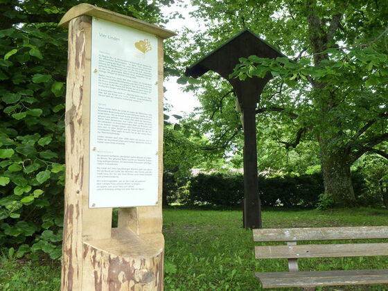 Wir beginnen die Wanderung beim Kultur- und Tagungszentrum Murnau, überqueren die Bahnhofstraße, biegen in die Postgasse ein und gelangen nach wenigen Metern in die Fußgängerzone. Hier halten wir uns rechts und sehen die Mariensäule und die Maria-Hilf-Kirche bereits vor uns. Eingefügt in die Häuserfassade wurde die Kirche zwischen 1653 und 1655 erbaut und beherbergt seit 1824 die Statue der angeblich wundertätigen Muttergottes, die zuvor auf dem Eichholz unter den „Vier Linden“ stand. Viele Wallfahrer zog es damals nach Murnau und noch heute erfreut sich die Muttergottes regen Besuchs. Beim Verlassen der Kirche wenden wir uns nach links, und biegen kurz darauf in die Schlossbergstraße ab. Nach der Haus-Nr. 12 a gehen wir rechts im Mayr-Graz-Weg weiter und passieren die St. Nikolaus-Kirche, die erstmals 1341 urkundlich erwähnt wurde. Der Hl. Nikolaus wurde als Patron der Fuhrleute, Flößer, Bierbrauer, Apotheker und Wachszieher verehrt, alles Berufe, die damals in Murnau ansässig waren. Wir folgen dem Weg an der Gabelung rechts, kommen an der „Emanuel-von-Seidl-Grundschule“ vorbei und überqueren kurz darauf die Schwaigangerstraße. Wir sind jetzt „Am Eichholz“, folgen der Straße bergauf und kommen zu den „Vier Linden“, wo neben zwei Bänken eine Stele auf uns wartet.