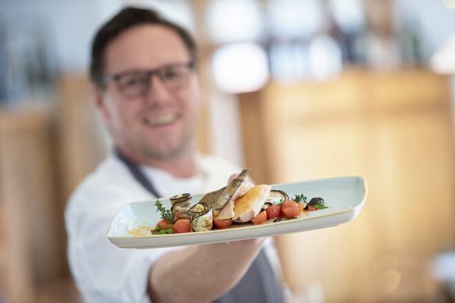 "Mit der feinen Gastronomie machte Franz Tanner schon als Bub Bekanntschaft. Regelmäßig nahm ihn nämlich sein Vater in das Kurhausstüberl Waging mit, wo damals der Stern von Alfons Schuhbeck aufging. Gekocht hat er dann selbst in renommierten Restaurants wie dem Bayerischen Hof in München. Von seinen eigenen Sterneambitionen hat er sich längst verabschiedet und in seinem Landhaus eine gehobene, regionale, alpenländische Küche entwickelt, die sich 'schon auch Familien leisten können', so der Wirt. Gerne unternehme er Ausflüge ins Orientalische, bei den Gewürzen sowieso. Auch Hummus, Couscous oder Bulgur schätze er sehr. Ansonsten geht Franz Tanner nichts über das Regionale: Rindfleisch beispielsweise kommt von der Waginger Metzgerei Heilmaier, die Sternerestaurants in ganz Deutschland beliefert, die Fische stammen aus einer Fischzucht in Taching und aus Kirchanschöring bezieht er seinen Ziegenkäse. 30 bis 40 Prozent der Lebensmittel sind bei ihm bio. Regionalität auch beim Bier, beliefert wird das Landhaus vom Hofbräuhaus Traunstein." BR