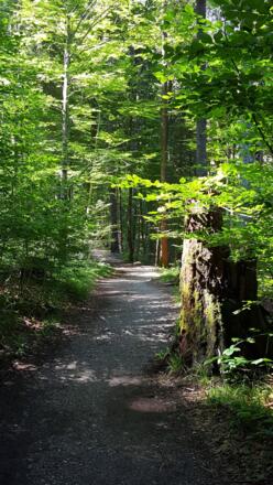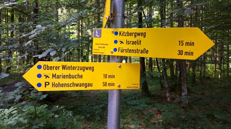 Wandern Sie zunächst entlang der Ostseite des Alpsees. Dabei kommen Sie am "Freibad am Alpsee" vorbei. An der äußersten Südspitze des Sees stoßen Sie auf den Lechweg, dem Sie den Berg hinauf folgen. Der Buchstabe L für den Lechweg und die Bezeichnung "Gnomensteig" übernehmen dabei die Führung. Ca. 100 m vor der "Marienbuche am Lobatboden" zweigt der Lechweg scharf nach rechts ab. Unser Weg geht jedoch an der Marienbuche vorbei und folgt im weiteren Verlauf dem "Oberer Winterzugweg" nach Nordosten bis zur Fahrstraße. Der "Obere Winterzugweg" ist ein schöner Pfad, von dem Sie immer wieder einen Blick auf die Seen und auf das Schloss Hohenschwangau erhaschen können.