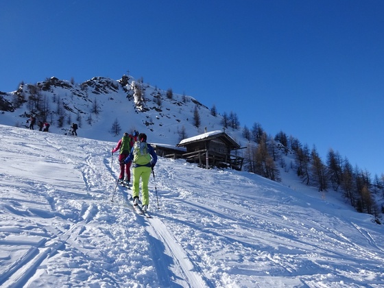 Auf den Windbichl: Vom Parkplatz über die Wiese hinauf (Zaundurchlass mit LVS-Kontrollstelle) und links auf eine Waldschneise zu. Entlang dieser nun immer in südöstlicher Richtung, mehrmals einen Forstweg querend, hinauf bis zu einer großen Lichtung auf einer Höhe von 1810 m.