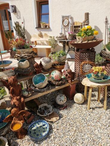 Vergessen Sie den Alltag und genießen Sie mit allen Sinnen die farbenfrohe Gartenwelt gespickt mit handgefertigten Keramik-Unikaten als Anregungen für den eigenen Garten. Meine Gartenkeramik ist frostsicher und ein Hingucker fürs ganze Jahr, kein Objekt gleicht dem anderen. Gartenkugeln in verschiedenen Größen, Zaunhocker, Lichterschalen, Vogeltränken, Vogelhäuschen, Schalen, Traumfänger, Sprüche, Namensschilder und noch vieles mehr können Sie in der Töpferwerkstatt sowie im Garten besichtigen und erwerben. Gerne fertige ich auch auf Ihren speziellen Wunsch ein Objekt an. Meine Töpferwerkstatt ist nach telefonischer Absprache jederzeit geöffnet.