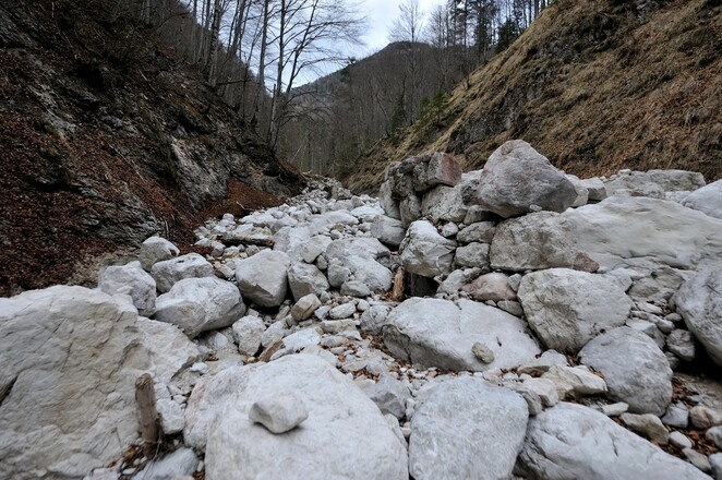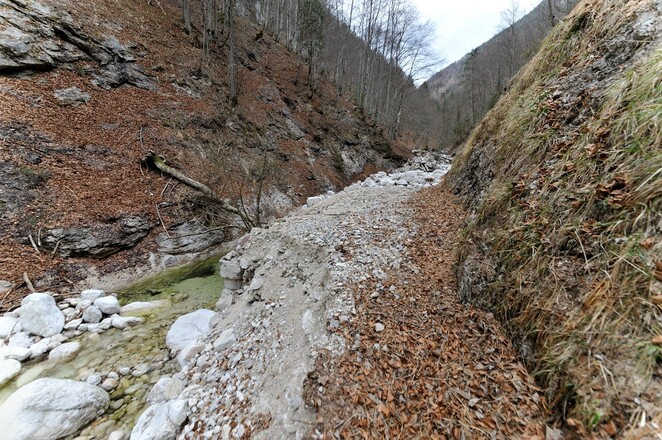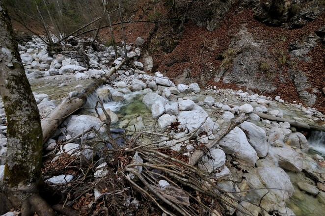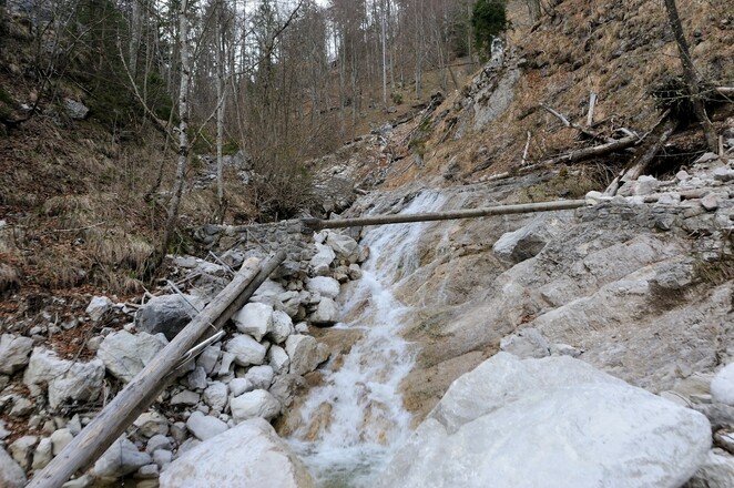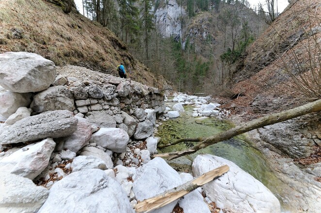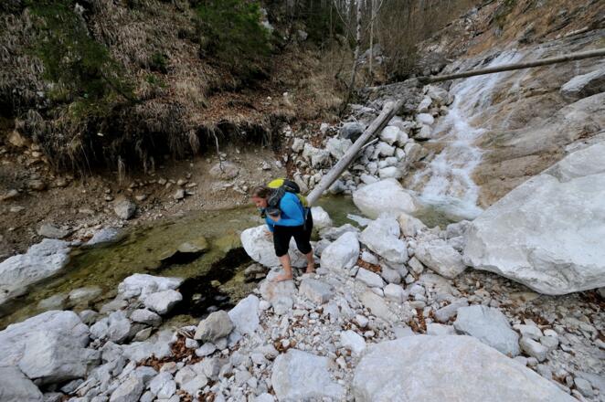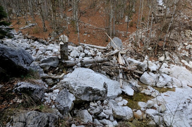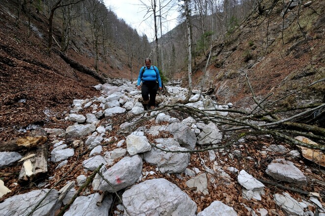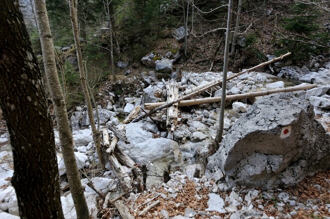 Wir klettern über kalkweiße Felsen zwischen denen riesige Baumleichen eingeklemmt sind, schlüpfen unter liegenden Bäumen hindurch, an manchen Stellen macht es durchaus Sinn, die Schuhe auszuziehen und durch den Bach zu waten. Wir müssen immer wieder nach alten Markierungen ausschau halten, um die Stellen zu finden, an denen der Bach überquert werden muss.