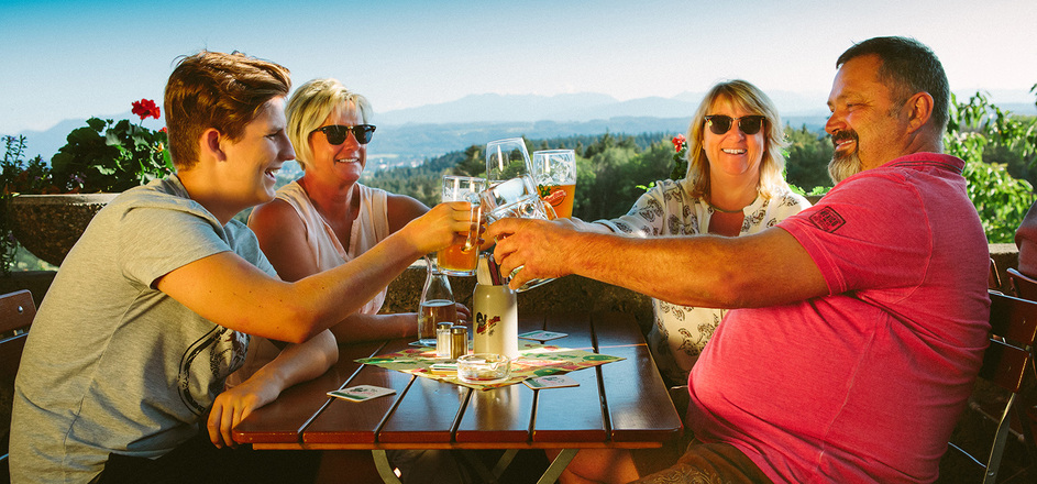 Wir bieten ihnen regionale Küche und eine fantastische Aussicht: Von der Benediktenwand bis weit über die Chiemgauer Alpen.