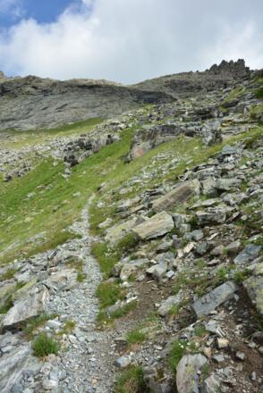 Der Weg des östlichen Georg Prasser Wegs führt über gemächliche Anstiege hinauf bis zum Schafbicheljoch. Er bietet einen schönen Blick ins Verwall.