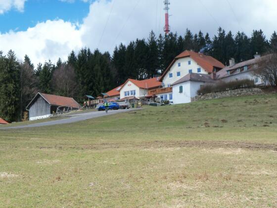 Diejenigen die sich für den Wanderweg entschieden haben kommen direkt unterhalb des Gasthauses aus dem Wald. Auf der rechten Seite geht es um das Haus herum wo ein großer Radlparkplatz den Drahtesel zum Abstellen einlädt.