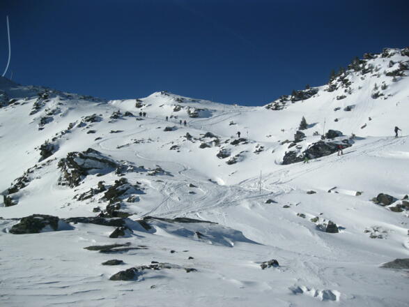 Abfahrt im Bereich der Aufstiegsspur wieder zurück zur Piste und über diese hinunter ins Tal.