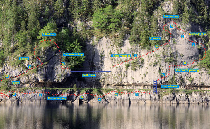 Vom Parkplatz zum Gosausee hinauf (5 Min.) und am Gosauseerundweg auf der Ostseite (links) etwa weitere 15 Minuten zum Einstieg. Zuerst die Nasenquerung zwischen Wanderweg und Wasseroberfläche bis zur Himmelsleiter, auf der die Felsplatten der Panoramaquerung oberhalb des Weges erreicht werden. Durch wunderschönen plattigen Dachsteinkalk geht es a la Michelangelo nun zum höchsten Punkt. Die Steinwanne beeindruckt mit herrlicher Aussicht zum Gosaugletscher und Dachstein. In einer großen Runde über das Fotoeck und die Theatermanege wird die Seilbrücke erreicht. Über diese und die Bügelreihe Dachsteinstiege hinauf zum Adlerhorst. Über den Balkon führt der Steig zum Ausstieg direkt beim Einstieg.