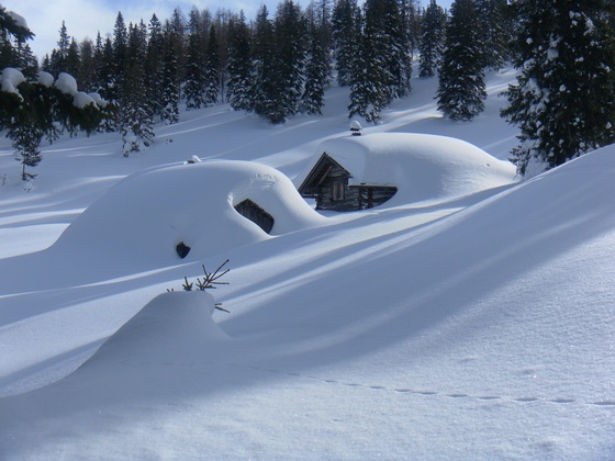 Vom Schwalbenkogel kann auch etwas steiler direkt nordwärts zur Grubenalm abgefahren werden (Achtung auf Dolinen)