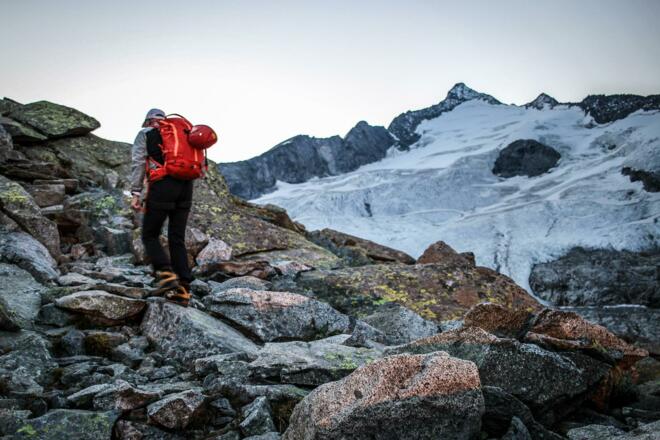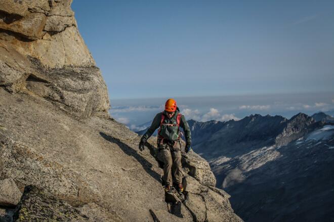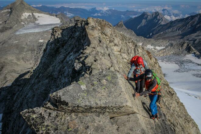 Im Gegensatz zum Stüdlgrat sind am Großvenediger Nordgrat keine Standplätze gebohrt oder Haken zu finden. Nur die Schlüsselstelle ist mit Haken abgesichert. Den Rest des Grates geht man seilfrei oder man sichert mobil und über Felsköpfe ab. Der Nordgrat ist sozusagen der wilde Bruder des Stüdlgrats. Er verlangt etwas mehr Gespür für den Routenverlauf, weil man sich nicht an Haken oder Markierungen orientieren kann.