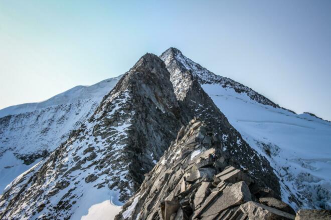 Ein weiterer Unterschied zum Stüdlgrat liegt im Gratverlauf selbst. Der Anstieg zum Großvenediger verläuft nie gleichmäßig aufwärts, sondern wird einige Male durch Passagen unterbrochen, die man abklettern muss. Häufig bewegt man sich in ausgesetztem Gehgelände im ersten oder zweiten Schwierigkeitsgrad.