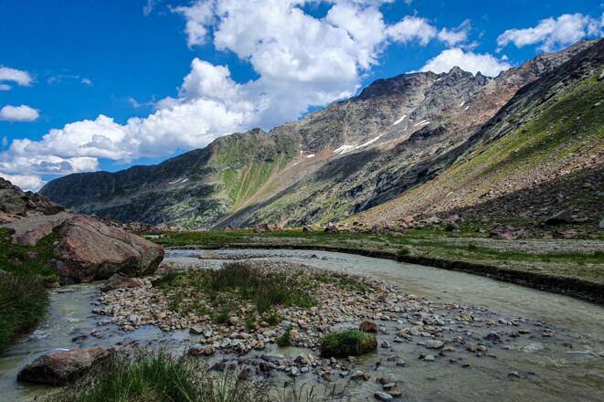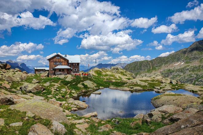 Nach 400 Höhenmetern flacht das Gelände etwas ab. Du erreichst einen wunderschönen Talboden, musst einen Gletscherbach überqueren und weitere 150 Höhenmeter zur Bremerhütte aufsteigen. Hier triffst du auf den Stubaier Höhenweg. Diesem folgst du für wenige Meter, bevor du die Bremerhütte erreichst, die idyllisch an einem kleinen See liegt.