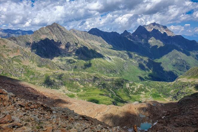 Sieht weit aus – ist es auch. Vier Kilometer fehlen noch bis zum heutigen Etappenziel. Von der Scharte geht’s auf der österreichischen Scharte ähnlich blockig und ungemütlich hinab, wie zuvor auf der italienischen hinauf.