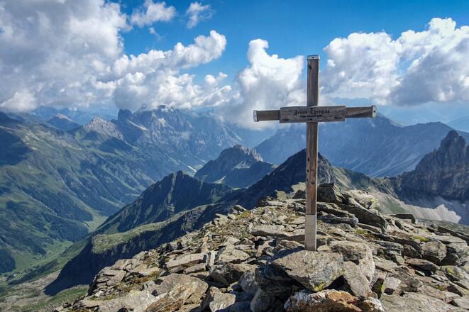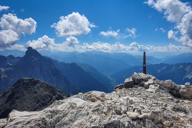 Kurz vor der italienischen Tribulaunhütte zweigst du scharf rechts ab und steigst über riesige Steinplatten zum Hohen Zahn auf. Der Hohe Zahn ist ein idealer Aussichtsgipfel direkt an der Grenze zu Südtirol. Auf der einen Seite blickst du tief ins Gschnitztal, auf der anderen weit ins Pflerschtal hinab. Die Tribulaune, die Weißwandspitze und das Panorama von den Stubaier Alpen bis in die Dolomiten runden die wilde Szenerie ab.