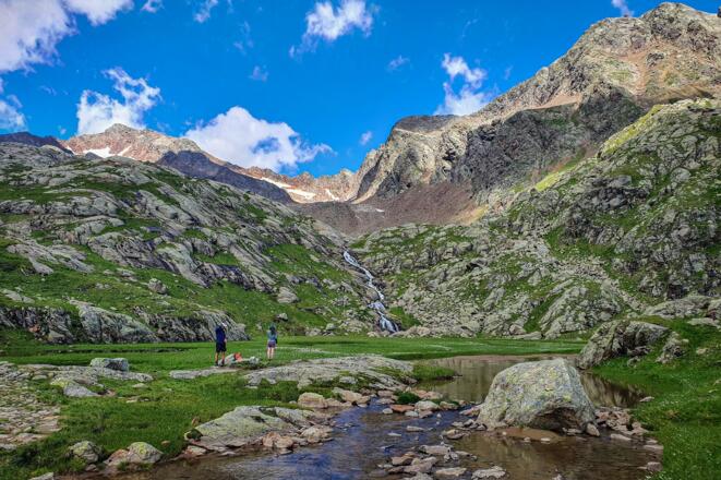 Von der Weißwandspitze fällt der Steig steil durch teils seilversichertes, felsiges Gelände ab, bis du am Stubensee wieder im Grünen ankommst. Wollgras säumt den Weg, ein Wasserfall plätschert und nach langer Zeit wirst du hier wahrscheinlich wieder andere Wanderer treffen. Hier machst du am besten eine kurze Pause. Denn der letzte Anstieg wird ungemütlich.