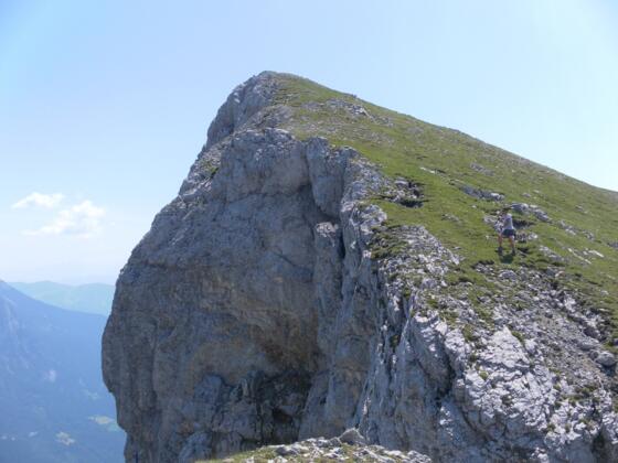 Nur wenige Meter geht es am Anstiegsweg zurück, dann schwenken wir nach Süd und ersteigen den ersten Südgratzacken des Tristkopfs. Der gesamte Abstieg am Südgrat geschieht weglos. Man muss sich mehr oder minder an der teilweise sehr exponierten Gratkante halten. Selten lässt sich etwas in die brüchige Ostflanke ausweichen. Leichte Kletterei bis I° ohne Sicherungsmöglichkeiten versüßt am schmalen und brüchigen Grat die 150HM Abstieg in die Scharte vor der Tristkarschneid. Ihre westseitige Felsplatte wird direkt an der Gratkante etwas ausgesetzt und steil, aber einfach angestiegen, wir erreichen eine dicht mit Latschen bewachsene Abdachung. Alte, ausgeschnittene Latschengassen (teis schon wieder zugewachsen) und kurze Graspartien mit erkennbare Pfadspuren wechseln ab. Man bewegt sich in einigem Auf und Ab knapp an der Abbruchskante zur Salzach. Die Grasfläche der Schönhöh wird überschritten, bevor es auf Grasmatten und später in typischem Karstgelände rechts der Graterhebung in das Bergeralblschartl hinunter geht. Der karstige Grassattel wird durchschritten und der erste Felsaufschwung der Bergeralmschneid westseitig in der Schrofenflanke gequert (wenige Steindauben). In der ersten Schrofenrinne steigen wir nach links auf den Gratrücken hinauf. Die Bergeralmschneid wird am breiten Grasrücken in einem weiten Rechtsbogen bis zum flachen Verbindungsrücken zum Riffelkopf hinaufgewandert. (Ein „kleiner Ausflug“ auf die Hochschottwies nach rechts über einen Vorhügel und am breiten Südgratrücken wäre ein Ausflug auf den höchsten Gipfel des Kammes.) Wir wandern in einem weiten Linksbogen am Kamm weiter und steigen über steiles Karstgelände in die Scharte vor dem Tristkopf ab. Etwas unterhalb der nordseitigen Abbruchskante wandern wir am karstigen Wiesenhang zum Steinmann des Vorgipfels. Kurz muss steil in die Gipfelscharte abgekraxelt werden (I-), dann wird aus der Scharte direkt über das gutgriffige Felsband (II) auf den grasigen Hauptgipfel mit Steinmann und altem Gipfelbuch hinaufgeklettert. Das Felsband lässt sich links über brüchiges Schrofengelände (I-) etwas ausgesetzt auch umgehen, dann nach rechts in wenigen Schritten zur grasigen Gipfelkuppe hinauf.