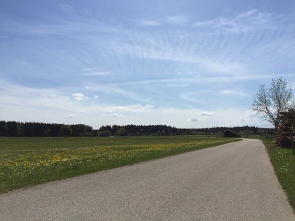 In Aufhofen rechts halten nach Eulenschwang. Hier ist der steilste Teil der Strecke. Circa einen Kilometer geht es auf der wenig befahrenen Straße steil hoch ca. 9 % nach Eulenschwang.
