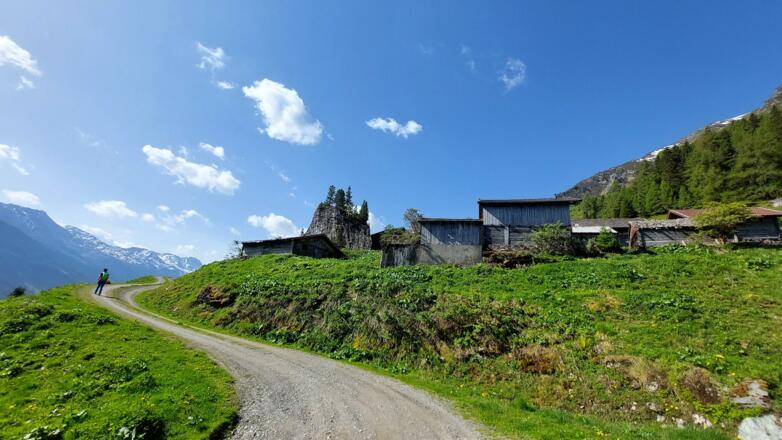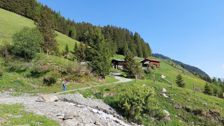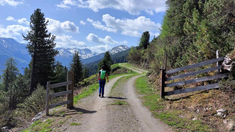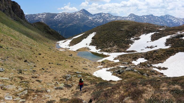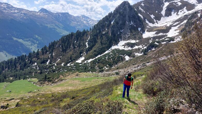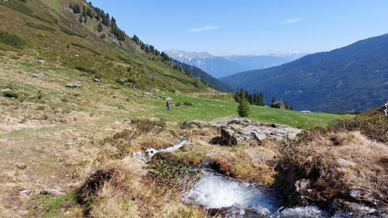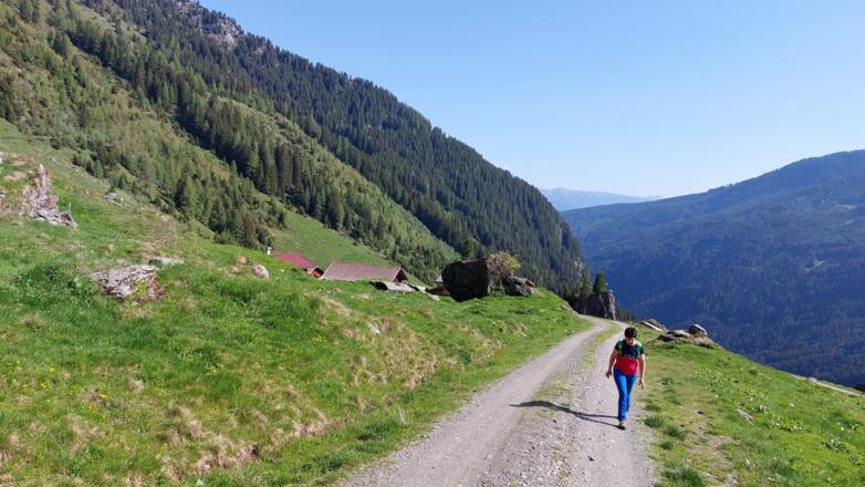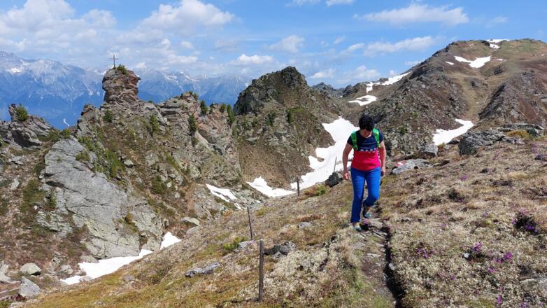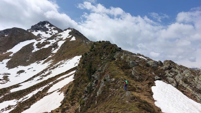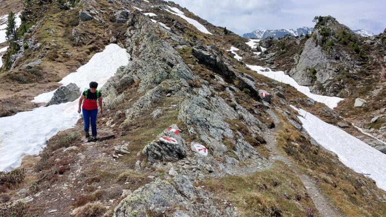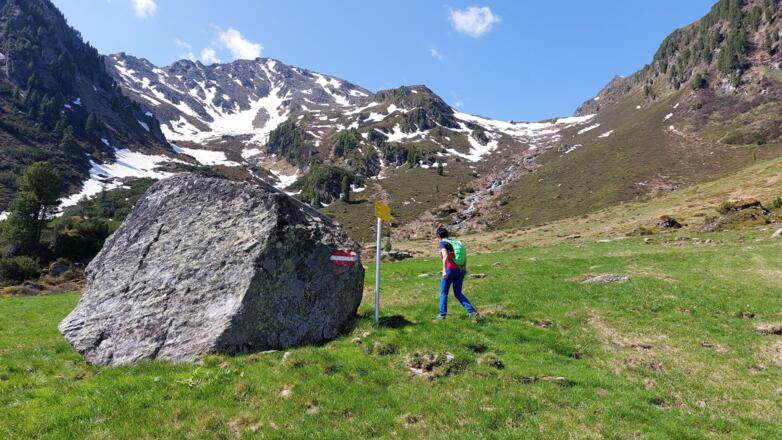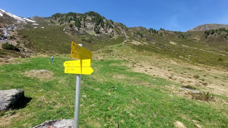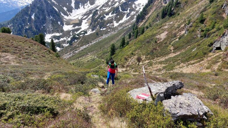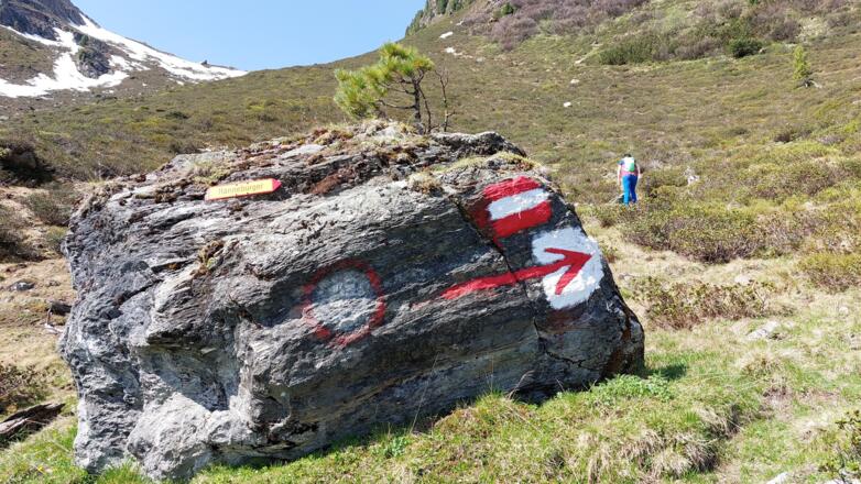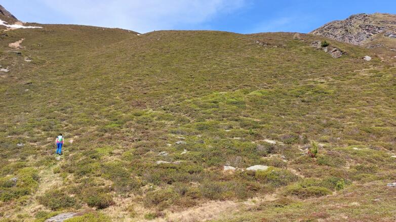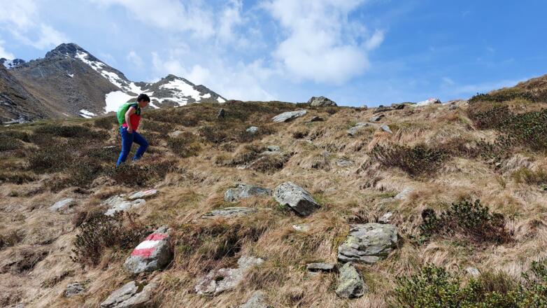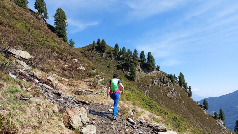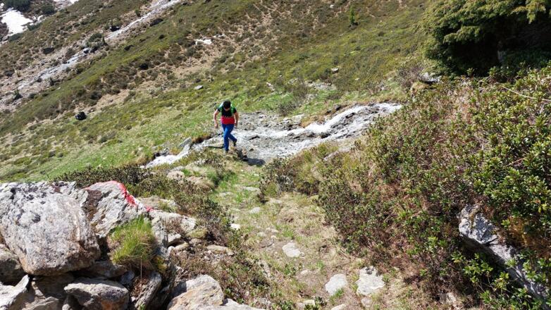 Zuerst noch über Wiesen parallel zum Bach, dann zieht unser Steig rechts aufwärts, dann ab ca. 2000 m in nördlicher Richtung diagonal durch den mächtigen Osthang bis auf einen mit Zirben bewachsenen Geländevorsprung. Jetzt noch über einen Steilhang mit Zwergsträuchern, der oben nach rechts in ein kleines Hochtal führt (Brunnen). Dem Talverlauf und dem Bächlein folgen und am Ende über den Grashänge hinauf auf den Kamm. Hier mündet unser Steig in den Bergweg, der vom Largoz bzw. vom Rosskopf kommt.