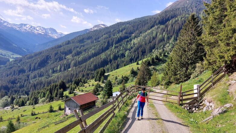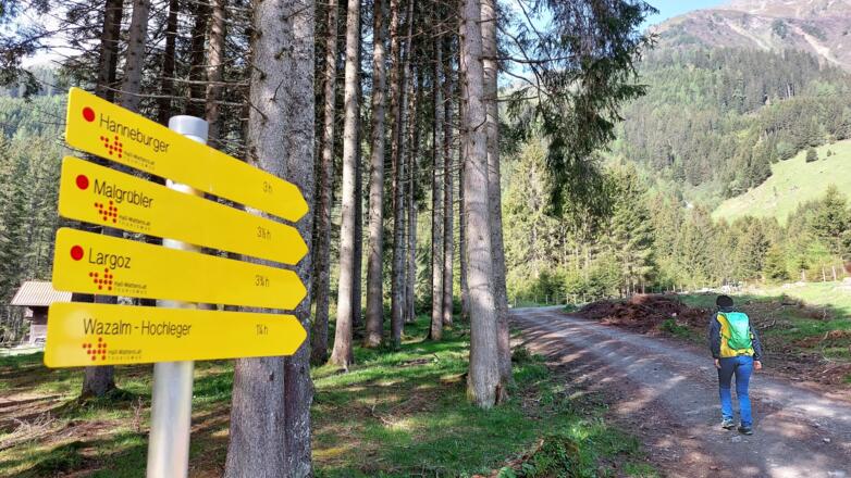 Aufstieg: Vom Parkplatz kurz auf der Fahrstraße hinunter zum Wattenbach, über die Brücke (Wegweiser "Hanneburger") und von nun an auf der Forststraße weiter. In ca. 40 Minuten erreichen wir über den Weiler Tischleraste die Wazalm (Brunnen). Wir bleiben auf der Forststraße, die nach zwei Kehren weit nach Süden zieht, vorbei am Wazalm Hochleger (Brunnen), durch den Ochsengraben und weiter in das Hochtal zwischen Malgrübler und Haneburger bis auf 1900 m. Ein markanter Felsblock (Wegweiser) markiert das Ende der Forststraße und den Beginn der zweiten Etappe unserer Tour.