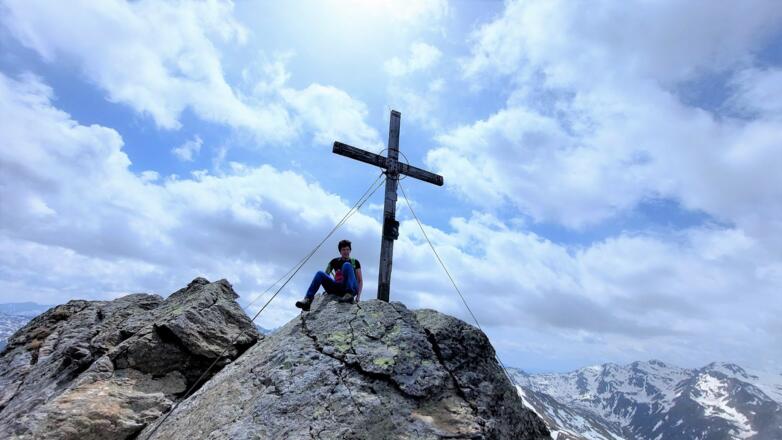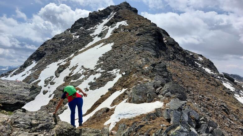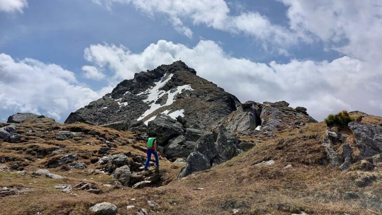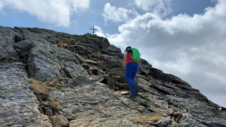 Auf dem gut markiertem Steig steigen wir über den Nordrücken des Haneburger auf eine Geländestufe. Dort wenige Meter in leichtem Felsglände abwärts und über ein kurzes Flachstück zum letzten Aufschwung. In Serpentinen führt der Weg zunächst unschwierig über den steinigen Wiesenhang. Im oberen Teil wird es zunehmend felsig und auch der Einsatz der Hände kann hilfreich sein. Die letzten Meter in leichter Kletterrei zum Gipfelkreuz (2576 m).