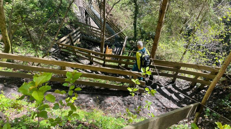 Bei Nässe ist der Abstieg in die Klamm eventuell rutschig, hier ist dann etwas Vorsicht geboten, wobei ein durchgängiges Geländer vorhanden ist.