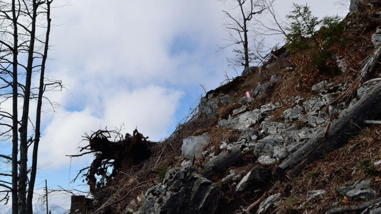 Vom Parkplatz beim Gasthaus geht es nach norden auf einem Forstweg über einen Bachlauf. Beim Wegweiser dann rechts auf den schmalen Steig 433. Dieser zieht sich stetig moderat ansteigend den Waldhang hinauf. Dabei wird zwei mal ein Bachlauf gepuert. Der erdige, wurzelige Steig führt zu einer Jagdthütte dahinter in nordwestlidhe Richtung bis zur Lichtung. Hier zweigt der Steig zum Mittagstein (Raukogel) nach rechts ab. Wir halten uns links und folgen dem Steig. Überall Totholz und umgestürzte Bäume. Auf dem Kamm hat man dadurch stetig gute Sicht auf das Tote Gebirge. Nach knapp 3 Std. steht man am Gipfel mit Weitblicken ins Alpenvorland und zu den 2000er des Toten Gebirges. Zurück geht es auf der selben Route.