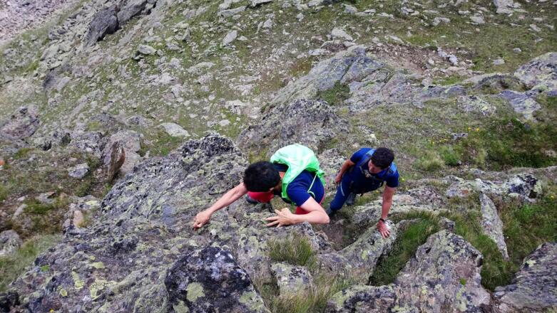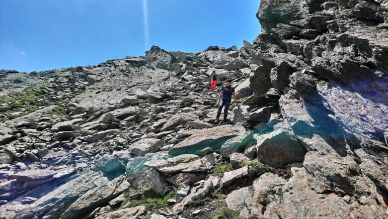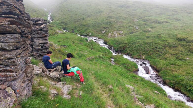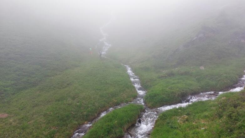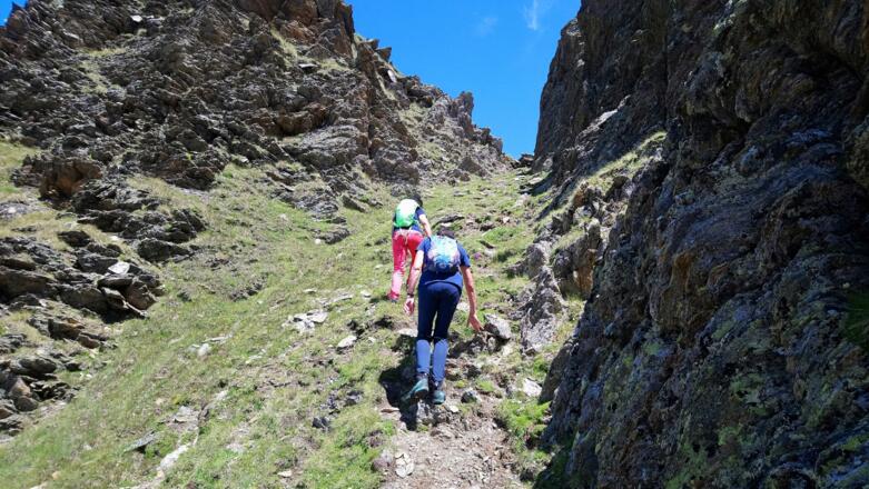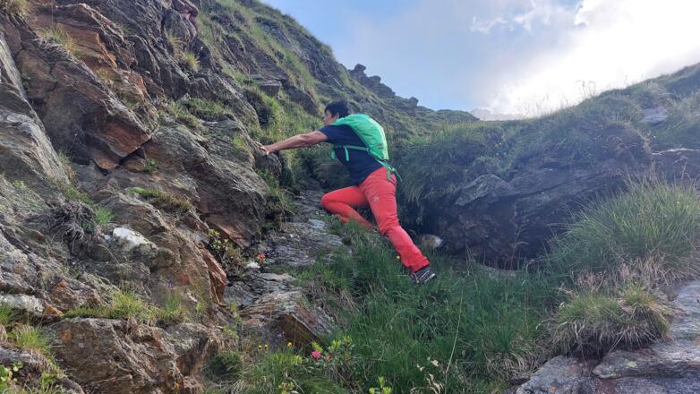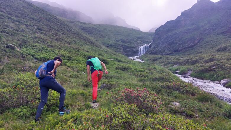 Der Bachlauf ist für die folgenden ca. 500 Höhenmeter unsere Orientierung: Wir bleiben immer knapp links (bzw. orografisch rechts). Durch Almrosen und Grasgelände aufwärts. Der Bach teilt sich auf 2100 Meter, wir bleiben immer am linken (nördlichen) Wasserlauf, ein kleiner Wasserfall auf ca. 2200 Meter. Es wird steiler, ein wenig Gespür fürs Gelände ist gefragt, um den einfachsten Weg zu finden. Auf ca. 2300 Meter verengt sich das Gelände zu einer kurzen Rinne, eine kurze Kletterstelle, danajch immer noch recht steil durch Gras und Blockgelände aufwärts bis es auf 2560 m flacher wird uns wir in südlicher Richtung einschwenken und das Hochtal mit den Bergseen (2620 m) erreichen. Erstmals wird der Gipfel der Hohen Röte sichtbar.