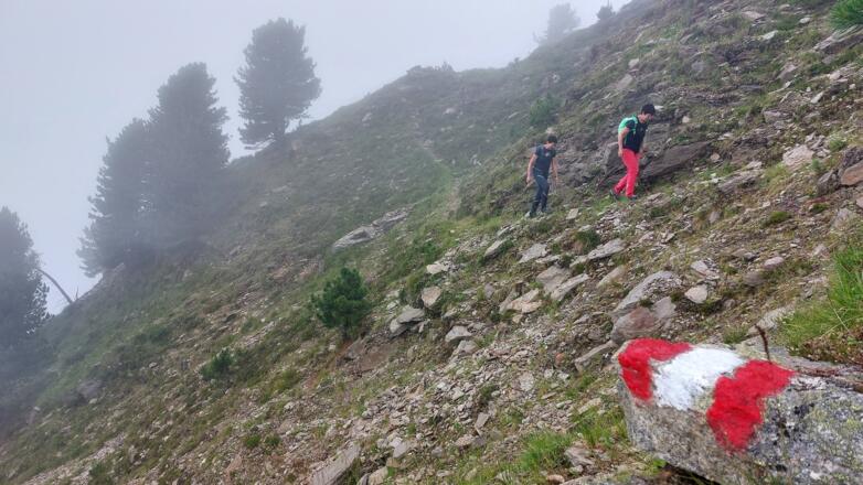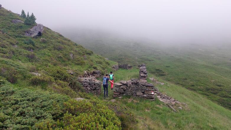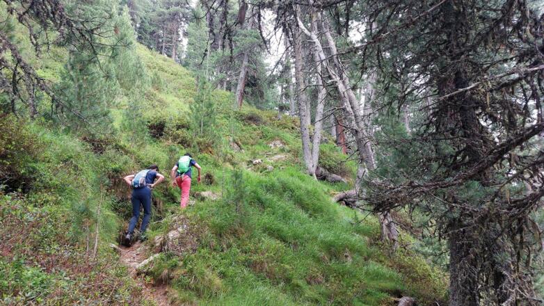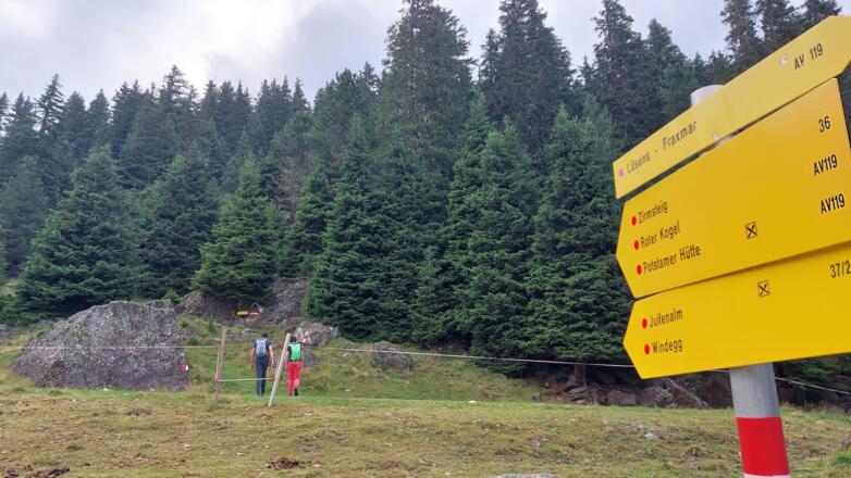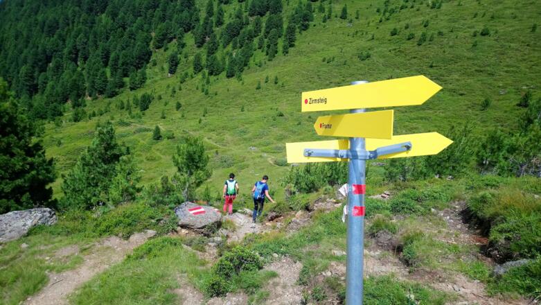 Vom Parkplatz (1600 m) an der Lüsenser Straße wieder wenige Meter talauswärts bis zu dem Schilderbaum. Hier in den "roten" Bergweg Richtung "Roter Kogel" einfädeln und unschwierig über die Gallwieser Alm zur Aflinger Alm (beide unbewirtschaftet) und weiter bis zur Abzweigung "Juifenalm/Windegg" (1920 m). Wir folgen rechts dem Zirmsteig Richtung"Roter Kogel - Potsdamer Hütte". Leicht ansteigend - zuerst noch durch uriges Wäldgelände - führt der Zirmsteig in südlicher Richtung, entlang des Westhanges des Roten Kogels. Nach ca. 700 Meter und bereits über der Waldgrenze erreichen wir die Weggabelung Roter Kogel - Zirmsteig. Wir bleiben rechts auf dem Zirmsteig (auf dem Weg zum Roten Kogel werden wir dann absteigen) und folgen diesem noch 1,5 Kilometer. Zuerst noch in freiem Gelände - vorbei an dem verfallenen Gallwieser Hochleger - tauchen wir dann noch einmal absteigend in den Waldgürtel ein - sehr steil (!) - und erreichen dann wieder freies Gelände und zuletzt die Steinmauern einer verfallenen Almhütte. Kurz dahinter, vor dem Bach, verlassen wir den Zirmsteig. Weiter, bis zum Gipfel des Roten Kogels, geht es "weglos".