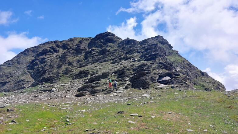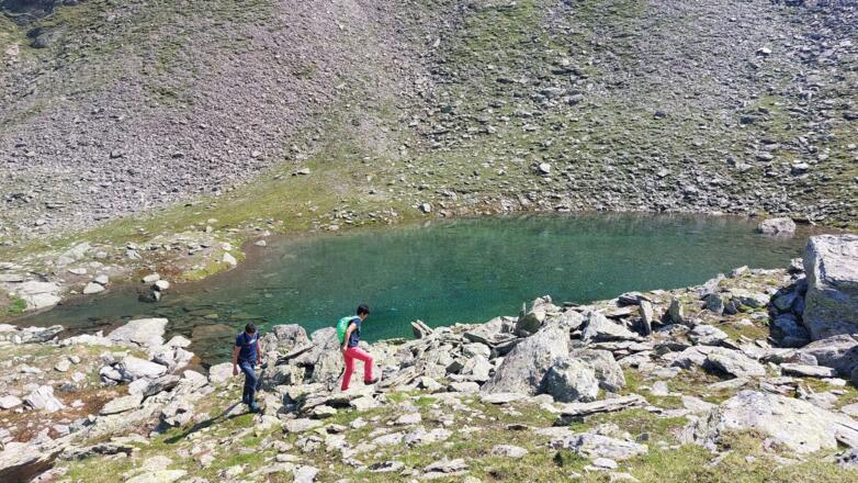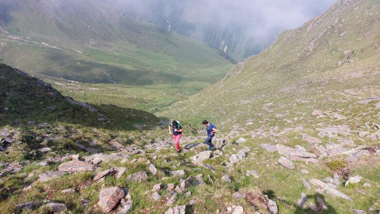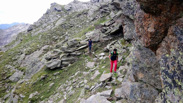 An den Seen vorbei - ansatzweise sind Wegspuren sichtbar - in südlicher Richtung durch den Talboden auf den Schotterhang zu, der hinauf zum Grat führt (2800 m).