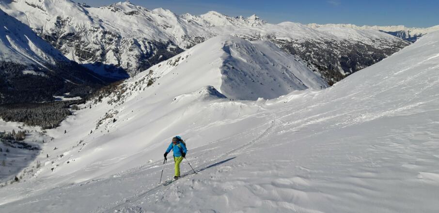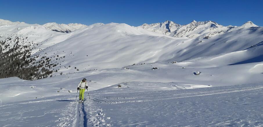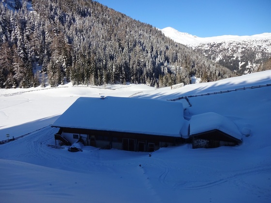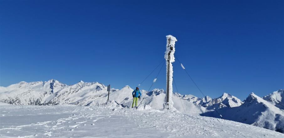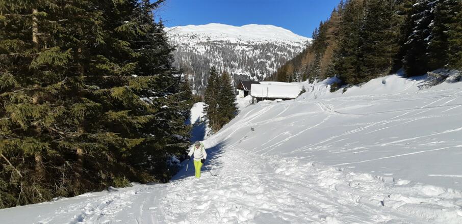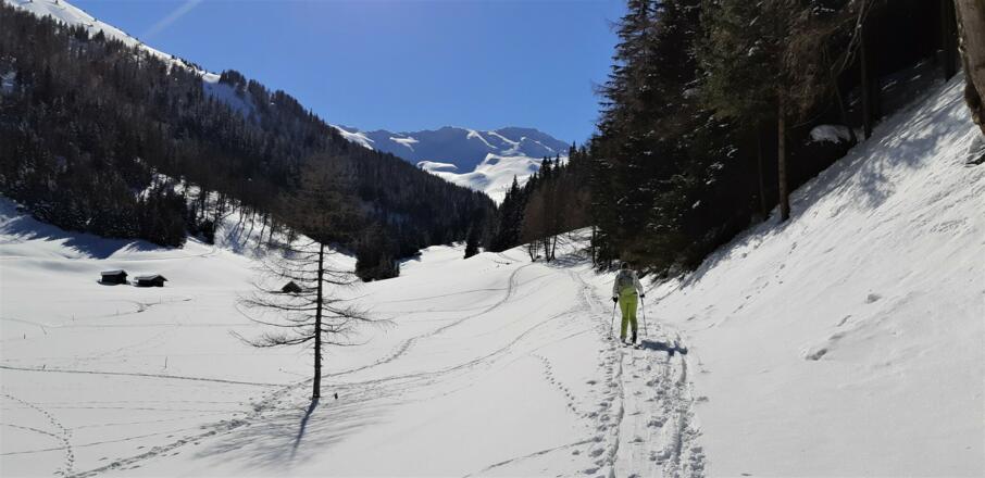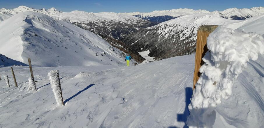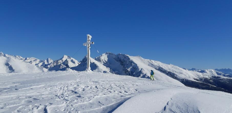 Route: Vom Koflerhof (Sägewerk) links entlang des Fraderbaches steil nach Süden in das Fradertal zur Fraderalm. Kurz flacher über die weiten Almflächen und weiter auf dem breiten Forstweg, auf der linken Talseite talein zum Fraderalm Hochleger (1948 m).Ab hier über schönstes Skigelände kurz ostwärts und dann in einem weiten Rechts - Linksbogen aufwärts in eine Einsattelung wenige Meter südlich vom Flachjoch.Weiter am Kamm nach Südwesten, einmal kurz wenige Meter auf die Südtiroler Seite abwärts, und am Schluss am breiten Rücken auf den Gipfel.