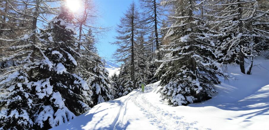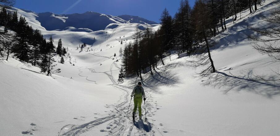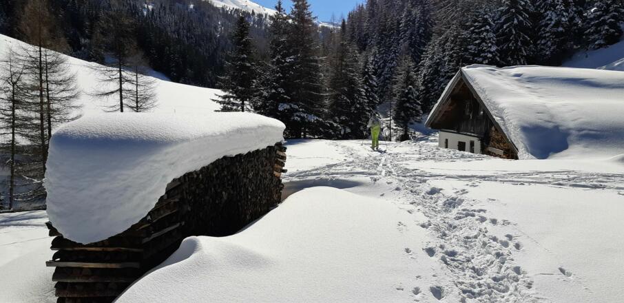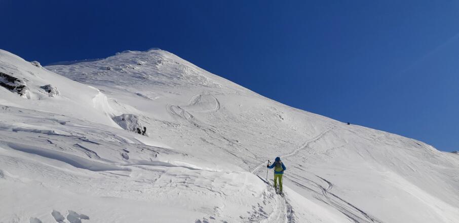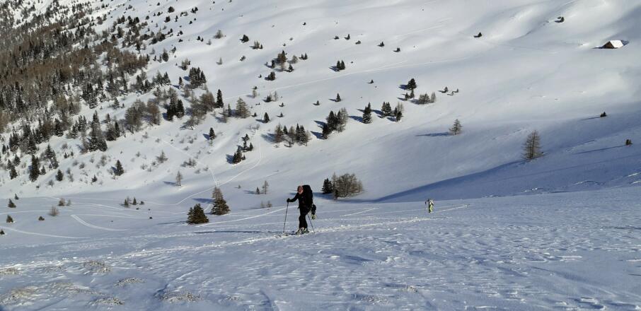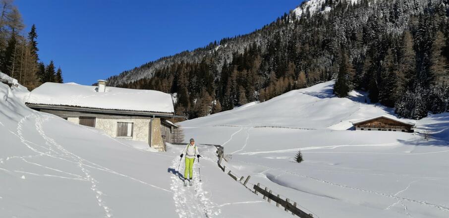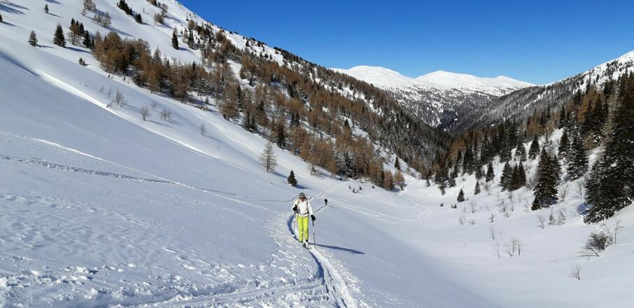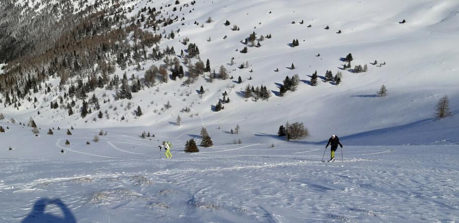Route: Vom Koflerhof (Sägewerk) links entlang des Fraderbaches steil nach Süden in das Fradertal zur Fraderalm. Kurz flacher über die weiten Almflächen und weiter auf dem breiten Forstweg, auf der linken Talseite talein zum Fraderalm Hochleger (1948 m).Ab hier über schönstes Skigelände kurz ostwärts und dann in einem weiten Rechts - Linksbogen aufwärts in eine Einsattelung wenige Meter südlich vom Flachjoch.Weiter am Kamm nach Südwesten, einmal kurz wenige Meter auf die Südtiroler Seite abwärts, und am Schluss am breiten Rücken auf den Gipfel.