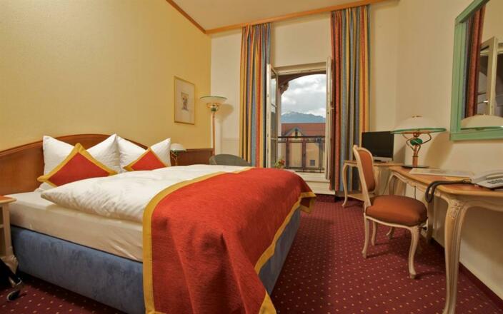 Umgeben von Allgäuer Alpen und Seen liegt im malerischen Königswinkel die Stadt Füssen. Das 4* Hotel Luitpoldpark befindet sich mitten im Herzen der Stadt, direkt am angrenzenden Stadtpark. Alle 131 Komfortzimmer und Suiten verfügen über eine hochwertige Ausstattung. Das Hotel ist für Tagungen, Seminare, Gruppen und Familien geeignet. Ein Haus auch für kulinarische Genießer. Der großen Fitness- und Wellness Park mit Saunen, Dampfkabine und einem Athletikcenter runden das grosse Angebot ab.SonstigesFreie Nutzung des großen Fitness- und Wellness Park. Tiefgaragengebühr 8,00 € f. 24. Std. Für Haustiere berechnen wir 10,00 € pro Tag (ohne Futter). Der Zutritt zu den Restaurants ist mit Tieren nicht erlaubt. W-lan im Haus vorhanden.