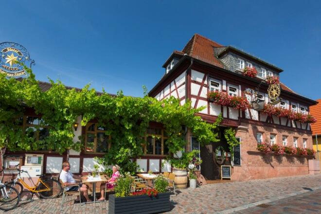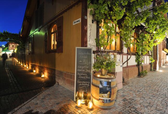 Gastlichkeit hat im STERN eine lange Tradition. Das historische Gebäude aus dem Jahr 1638 wurde sorgfältig restauriert. Romantische Sandstein- und Fachwerk-Architektur, eine erlesene Einrichtung und stilvolle Dekorationen ergeben ein harmonisches Ganzes. Die behagliche Atmosphäre der Räume wird bei sommerlichem Wetter ergänzt durch die von Weinreben umrankte, idyllische Gartenterrasse. Als familiengeführtes Hotel legen wir großen Wert darauf, unsere Gäste zu verwöhnen. Bei uns finden Sie alles, was zu einem angenehmen, erholsamen Aufenthalt beiträgt. Komfort und Individualität prägen unsere Zimmer und die modernen Bäder u.a. mit Whirlpool und Dampfdusche. Klaus Markerts kreative Küche ist geprägt durch die Verwendung frischer Produkte aus der Region. Ob bodenständige fränkische Gerichte oder exklusive Menüs: das Ergebnis ist immer ein kulinarischer Genuss. In den Gewölben unserer Sandsteinkeller lagern die besten Weine Bürgstadts, Frankens und internationaler Herkunft. Die hausgebrannten Edelobstbrände gehören ebenso zu unserem Angebot, wie selbstgekochte Marmeladen, hausgemachte Wurst und andere Schmankerln und Spezereien.