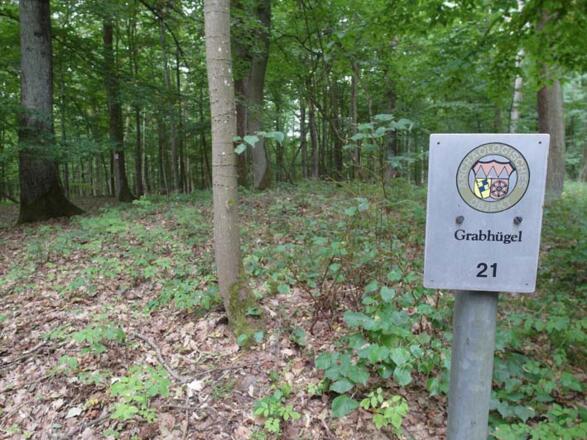 Am Röttinger Schützenhaus geht es dann knackig bergauf; die Route ist mit einem stilisierten Grabhügel bezeichnet. Damit ist auch das erste Zwischenziel markiert: Grabstätten von Kelten aus der Hallstadtzeit.