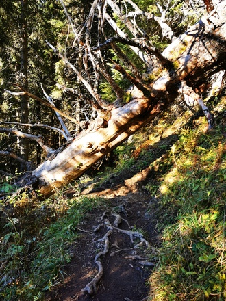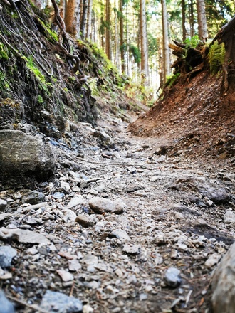 Gestartet wird auf einem Forstweg, der durch einen schönen Mischwald führt und schon bald in einen Wanderpfad übergeht. Das Säuseln und Rauschen von Wasser im Ohr geht es über die ein oder anderen Stufen und Baumwurzeln. An manchen Stellen ist der schöne Wanderweg sogar hohlwegartig oder führt unter über dem Weg liegenden Bäumen hindurch, was den Aufstieg abwechslungsreich gestaltet. Dazu tragen auch die tollen Ausblicke auf Ettal, die umliegenden Berge und ins Loisachtal bei. Weiter oben, wenn sich der Weg teilt, immer Richtung Laber laufen. Hier führt der Weg auch an ein paar Felsen vorbei. Hin und wieder lädt eine Bank zu verweilen und die Aussicht auf das Ettaler Manndl, den Soila See (im Sommer meist ausgetrocknet) oder das Loisachtal zu genießen.